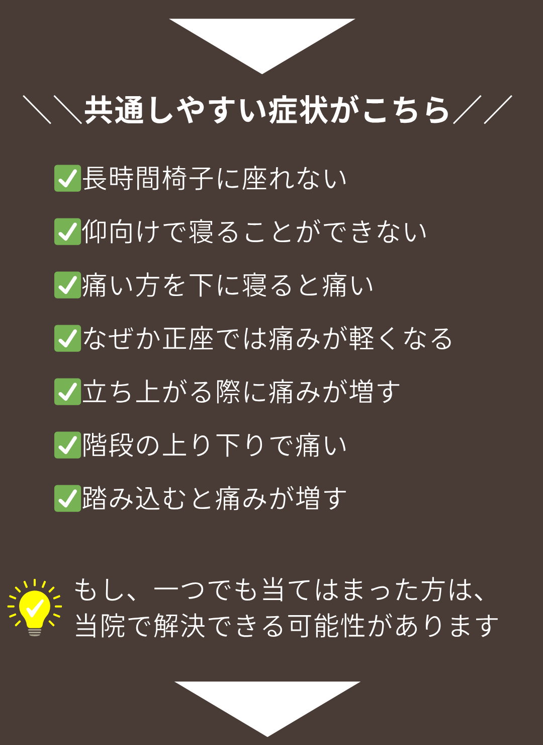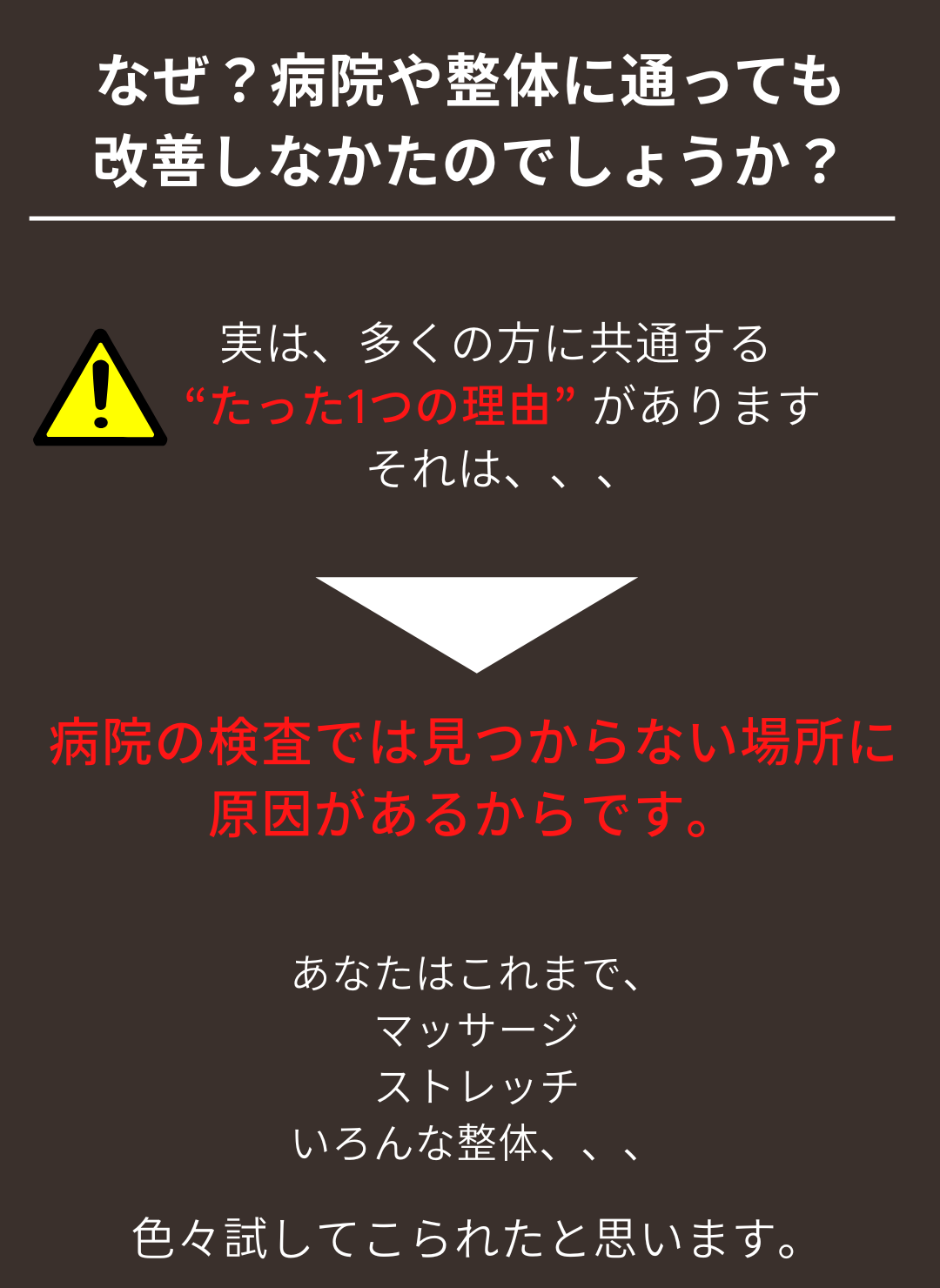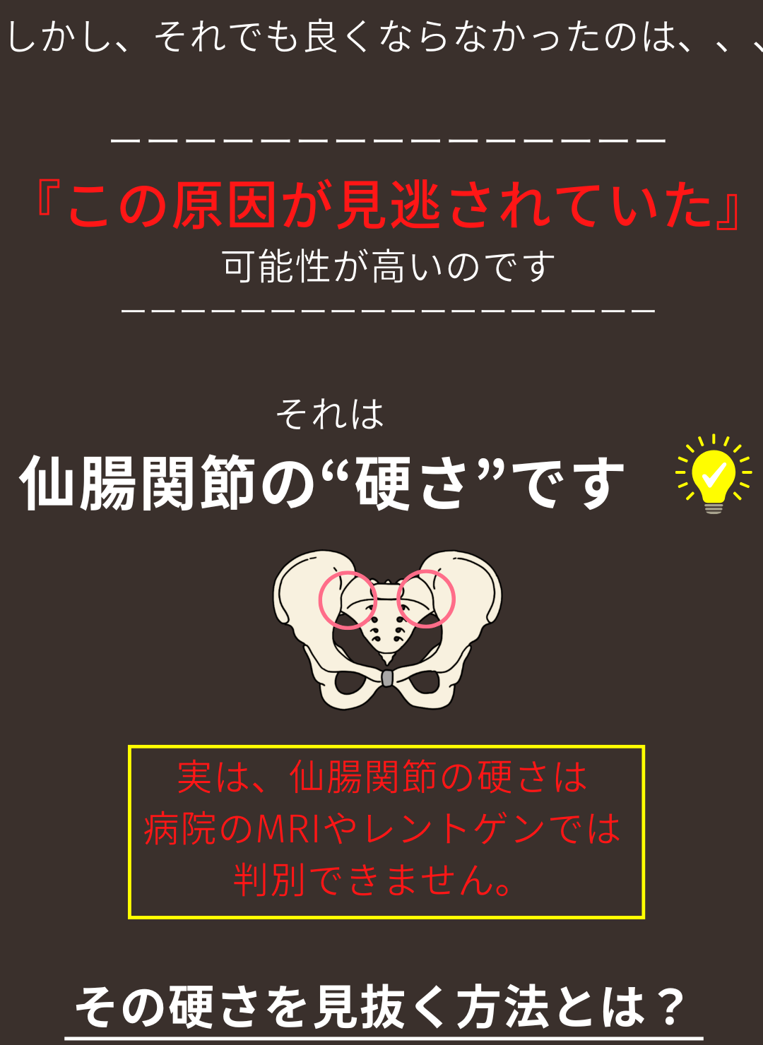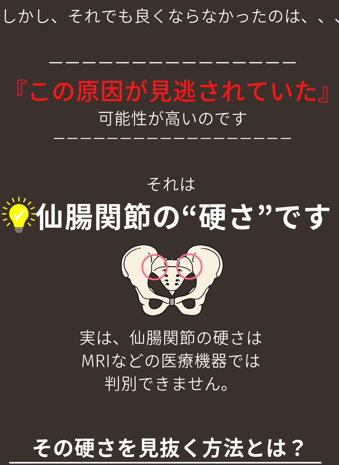 | 施術 | 職場のマニュアル通りで誰にでも同じ施術 | 仙腸関節と脊柱の動きに特化した施術 |