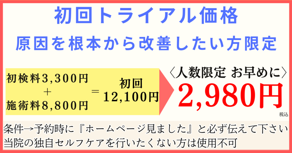 5回通院したのに少しも改善できなければ見切っていいです。日常生活の指導やアフターケアの提案をしない整体院・整骨院も見切るべきです。当院では一日でも早く楽になってほしいので、日常生活の指導や日常生活でのアドバイス、セルフケアを提案します。それが最速で改善する近道だから。