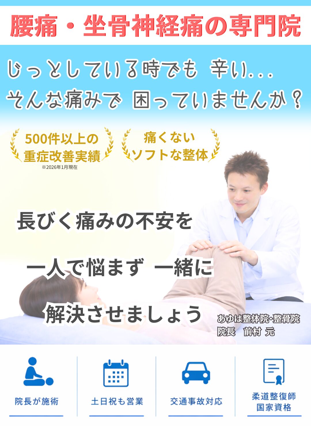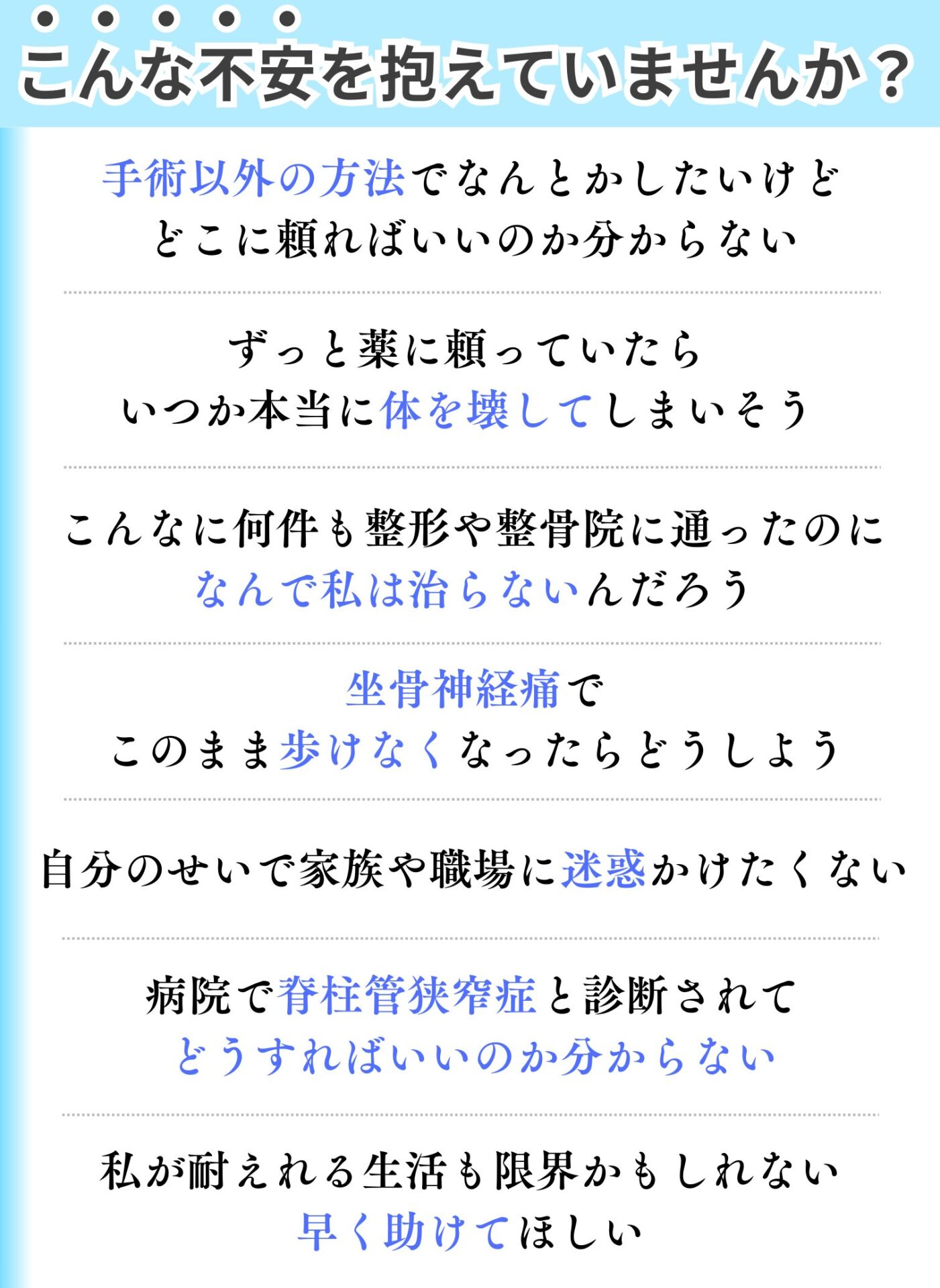 大丈夫です。中には当院でも手に負えないケースもありますが、改善できる方が圧倒的に多いです。病院では、薬で改善しなければ『手術をしましょう』と言われます。院長自身も18歳の時に病院で『腰を3カ所手術をしましょうと』言われた人間です。結局手術をしなくても院長の腰痛はセルフケアで改善しました。もしあの時、病院の言う通りにしていたら後悔していたと思います。